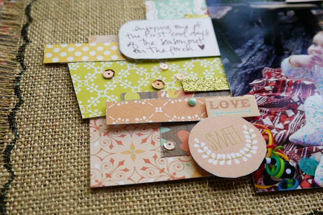 I don't know that I would ever think to use burlap on a page (totally not comfortable with my sewing machine... at least not yet), but it is perfect for a fall page! Also, have I mentioned how impressed I am with how much scrapping you are getting done? Sprinkle some of that mojo in the next drink you make for me, would 'ya? ;)